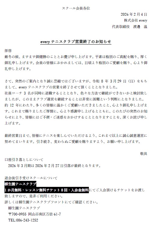 2026年3月末日をもって営業を終了させて頂きます。